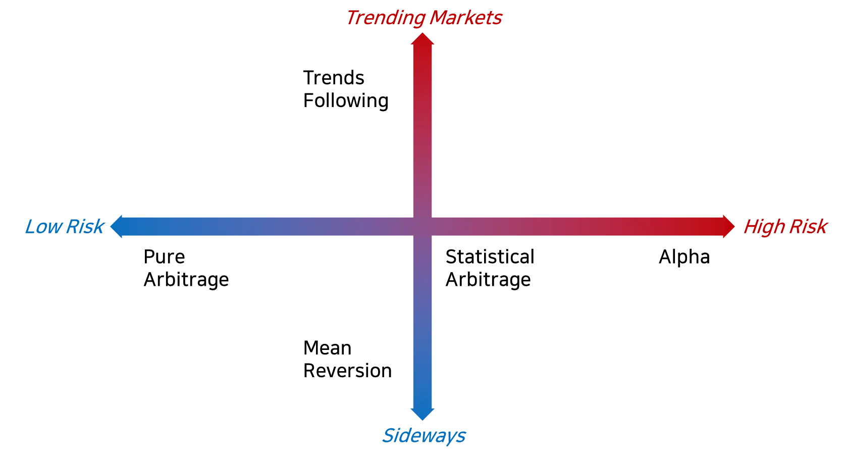 We categorize our strategies into three main groups based on risk level: 1) pure arbitrage, 2) statistical arbitrage, and 3) alpha.